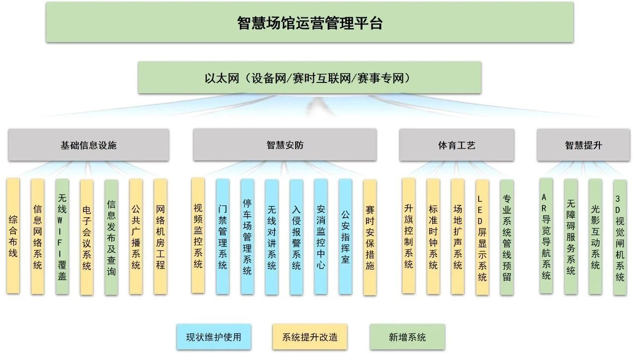 根据方案设计,广州体育馆计划新增一套平台、三套网,统筹24个系统,其中新增7个系统,提升11个系统,维护6个系统,可应用于赛事安全保障和赛事运营管理(日常票务运营、场馆客流统计分析、场馆智慧来访系统)等基础场景。